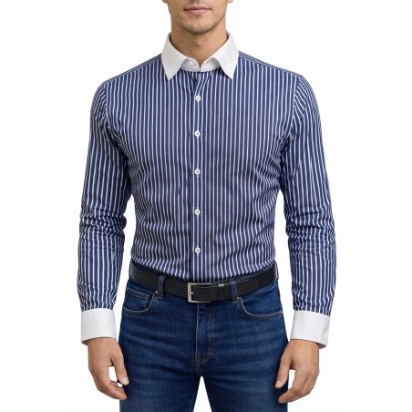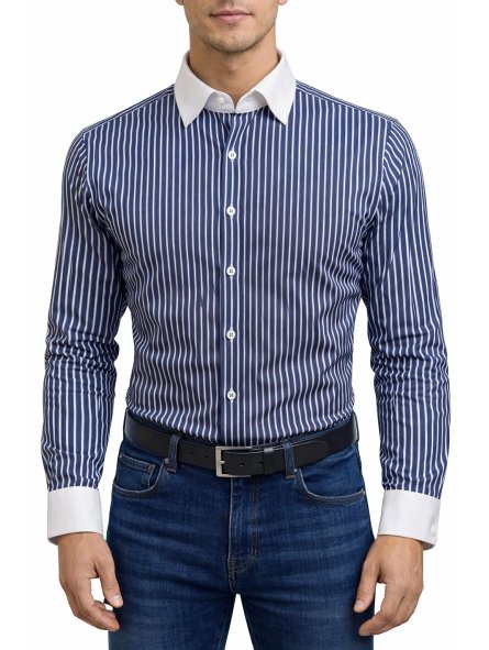 La chemise bleu marine à larges rayures à col blanc s’impose comme une pièce forte et intemporelle du dressing masculin. Élégante, structurée et polyvalente, elle accompagne l’homme moderne avec assurance.