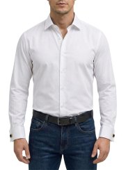 La coupe slim permet à la chemise de rester parfaitement en place sous une veste, sans excès de matière. Elle structure le buste, met en valeur la carrure et assure une ligne nette, essentielle dans une tenue formelle.