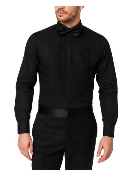 Une chemise noire, simple et précise, pensée pour les grandes occasions.