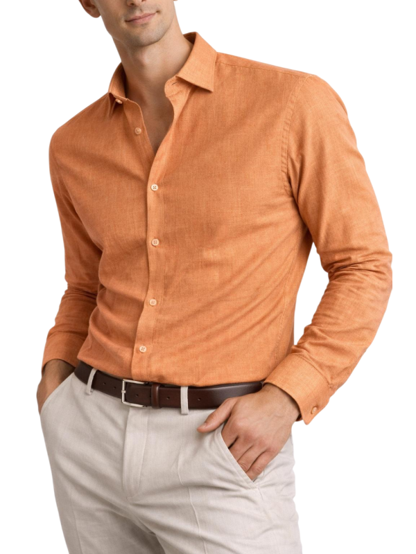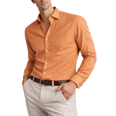 Rarement utilisée en mode masculine, la couleur orange révèle ici toute sa subtilité. Travaillée dans une nuance équilibrée, elle apporte de la lumière à la silhouette sans excès. Cette teinte réchauffe le teint, dynamise la tenue et crée un contraste élégant avec des pièces plus sobres du dressing.