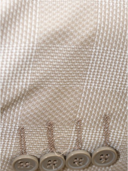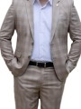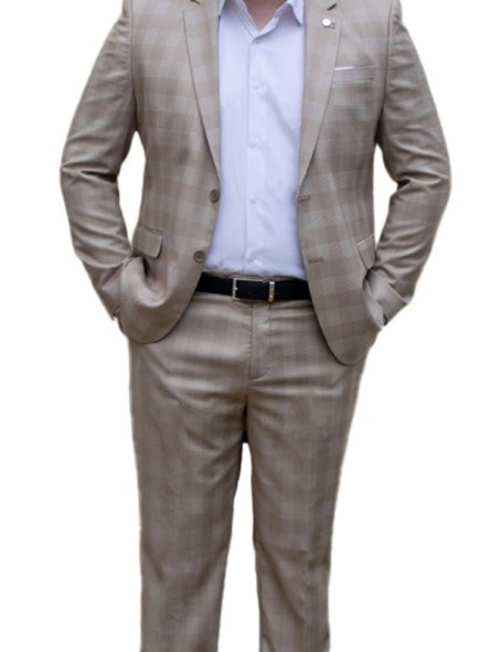 Ce costume beige à carreaux s’adapte facilement à différents contextes :